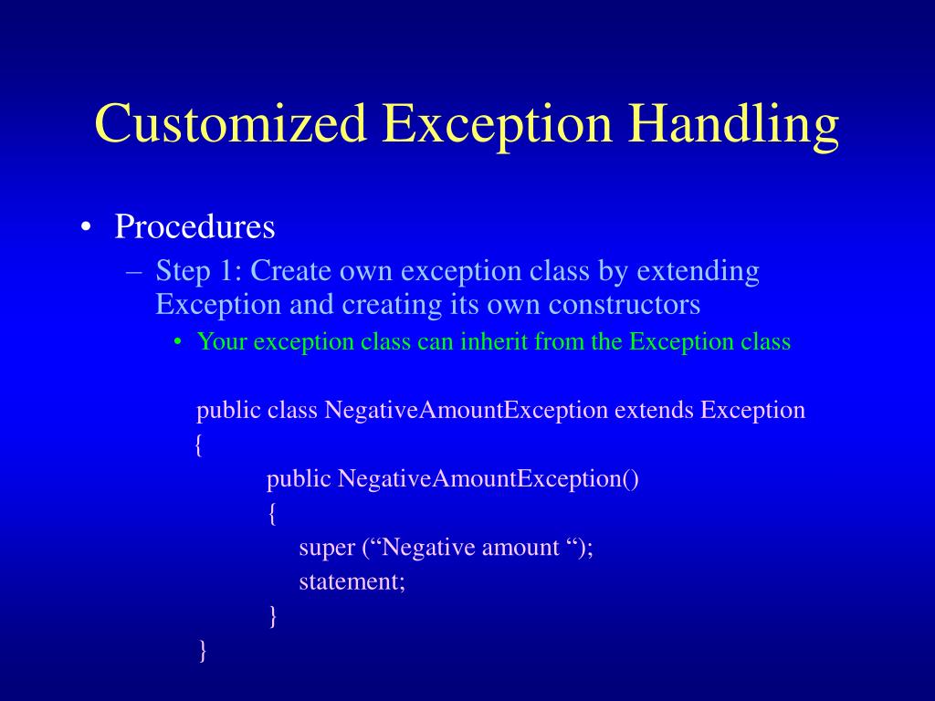 Customized Exception Handling • Procedures • Step 1: Create own exception class by extending Exception and creating its own constructors • Your exception class can inherit from the Exception class public class NegativeAmountException extends Exception { public NegativeAmountException() { super (“Negative amount “); statement; } }