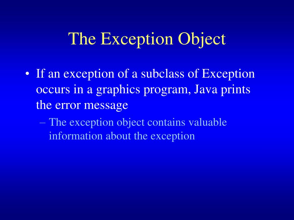 The Exception Object • If an exception of a subclass of Exception occurs in a graphics program, Java prints the error message • The exception object contains valuable information about the exception