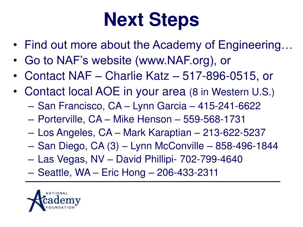 Next Steps • Find out more about the Academy of Engineering… • Go to NAF’s website (www.NAF.org), or • Contact NAF – Charlie Katz – 517-896-0515, or • Contact local AOE in your area (8 in Western U.S.) • San Francisco, CA – Lynn Garcia – 415-241-6622 • Porterville, CA – Mike Henson – 559-568-1731 • Los Angeles, CA – Mark Karaptian – 213-622-5237 • San Diego, CA (3) – Lynn McConville – 858-496-1844 • Las Vegas, NV – David Phillipi- 702-799-4640 • Seattle, WA – Eric Hong – 206-433-2311