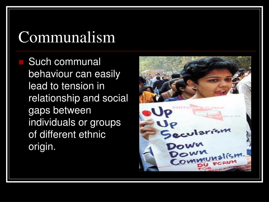 Communalism • Such communal behaviour can easily lead to tension in relationship and social gaps between individuals or groups of different ethnic origin.