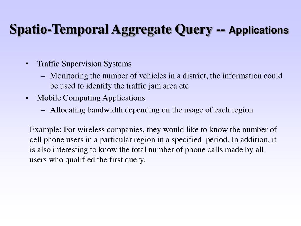 Spatio-Temporal Aggregate Query -- Applications • Traffic Supervision Systems • Monitoring the number of vehicles in a district, the information could be used to identify the traffic jam area etc. • Mobile Computing Applications • Allocating bandwidth depending on the usage of each region Example: For wireless companies, they would like to know the number of cell phone users in a particular region in a specified period. In addition, it is also interesting to know the total number of phone calls made by all users who qualified the first query.