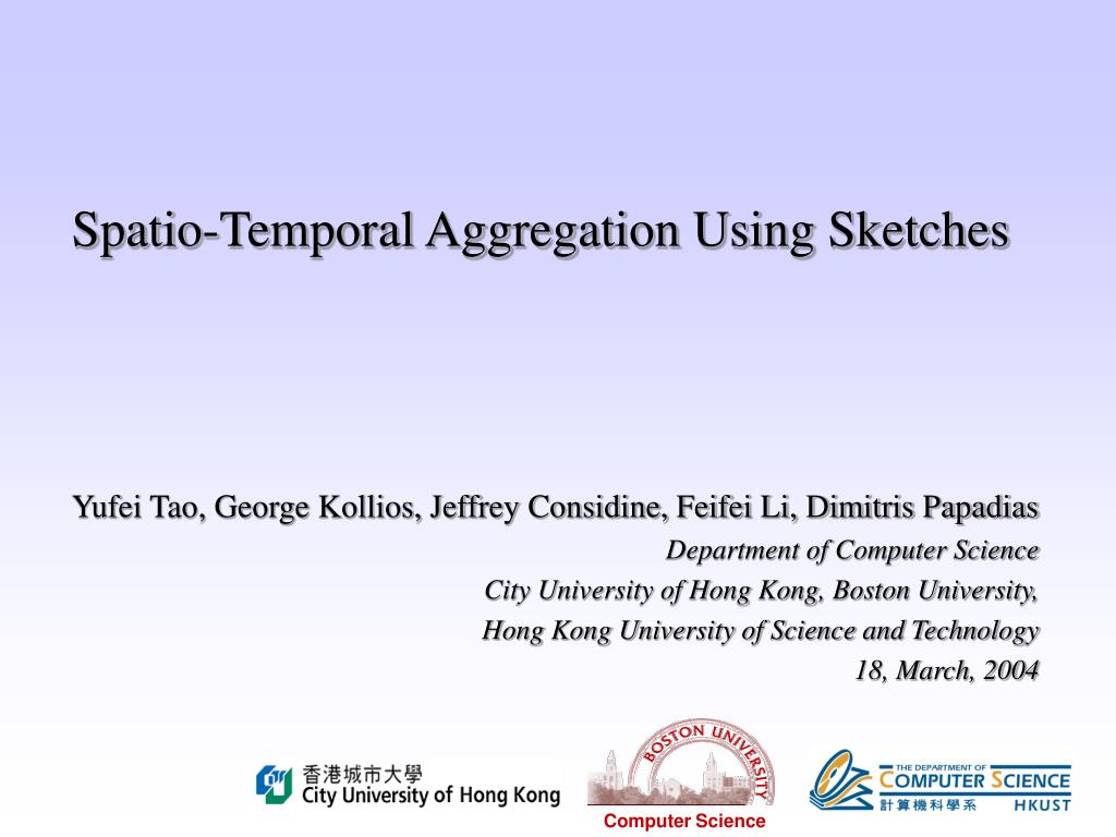 Spatio-Temporal Aggregation Using Sketches. Yufei Tao, George Kollios, Jeffrey Considine, Feifei Li, Dimitris Papadias Department of Computer Science City University of Hong Kong, Boston University, Hong Kong University of Science and Technology 18, March, 2004. Outline.