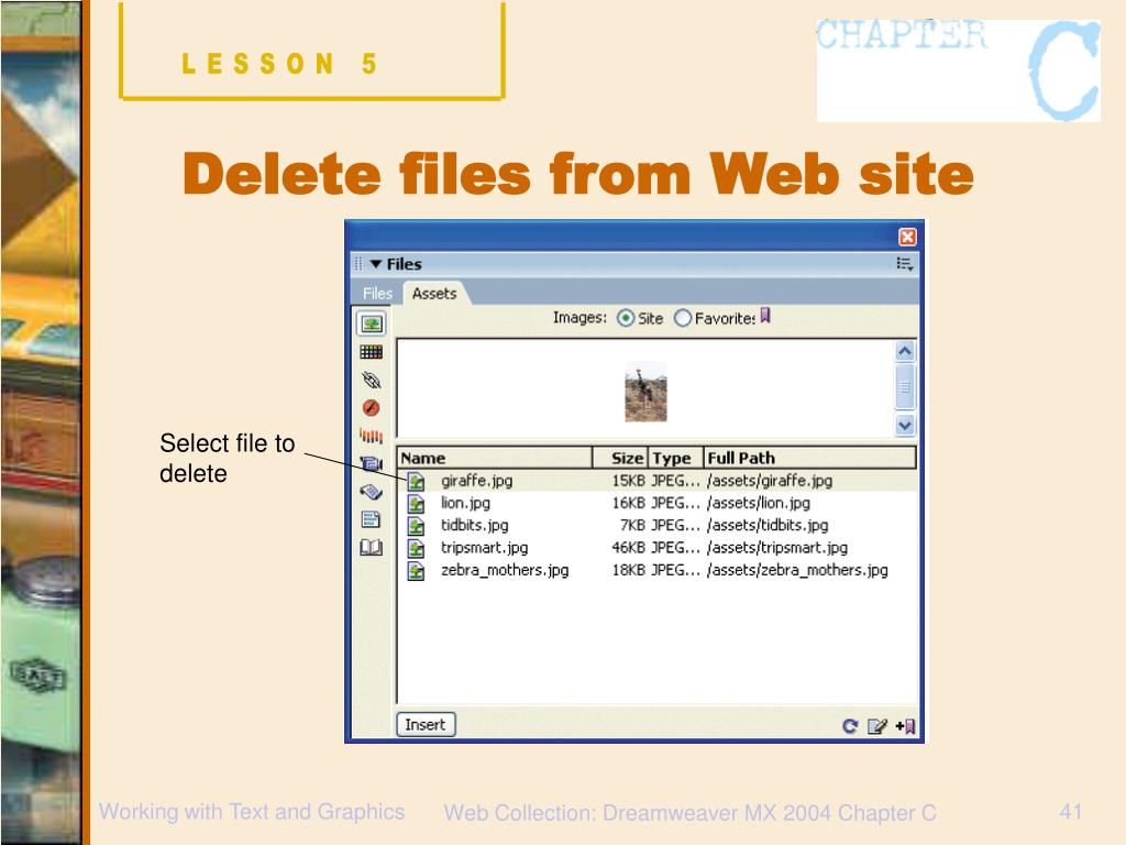 LESSON 5 Delete files from Web site Select file to delete Working with Text and Graphics