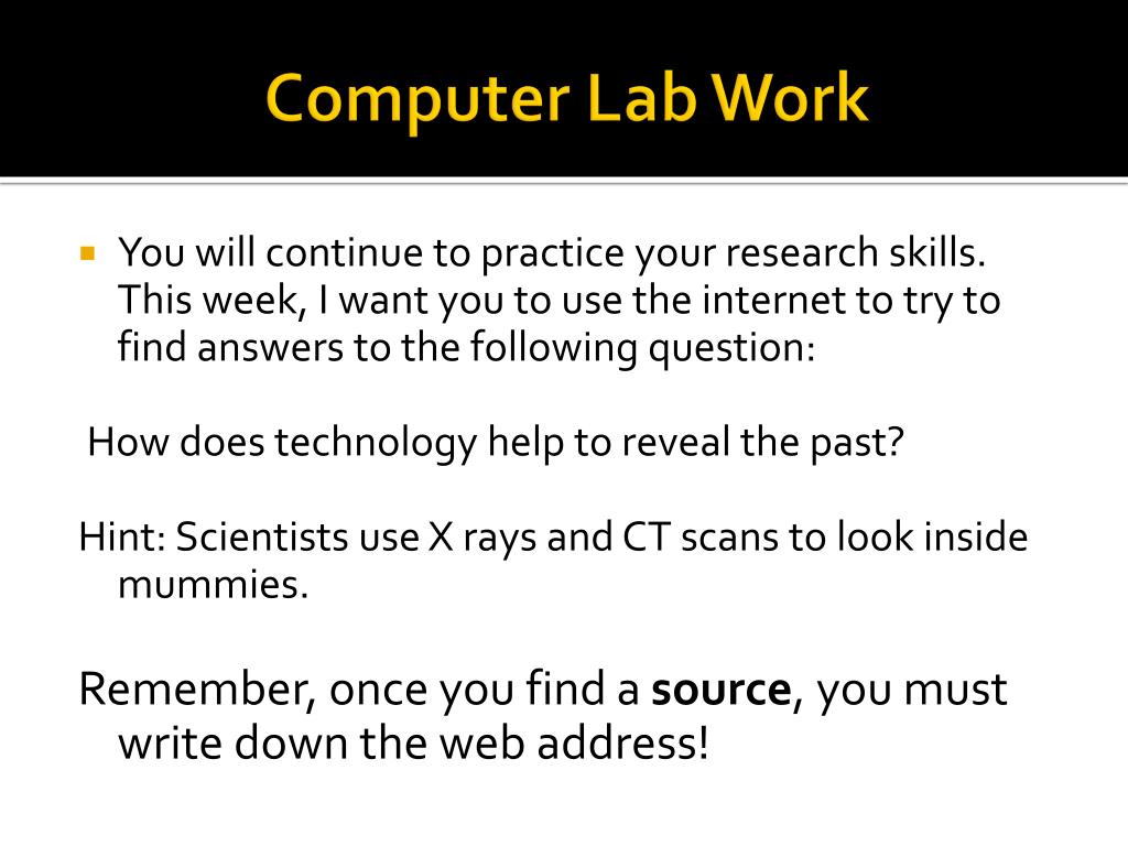 Computer Lab Work • You will continue to practice your research skills. This week, I want you to use the internet to try to find answers to the following question: How does technology help to reveal the past? Hint: Scientists use X rays and CT scans to look inside mummies. Remember, once you find a source, you must write down the web address!