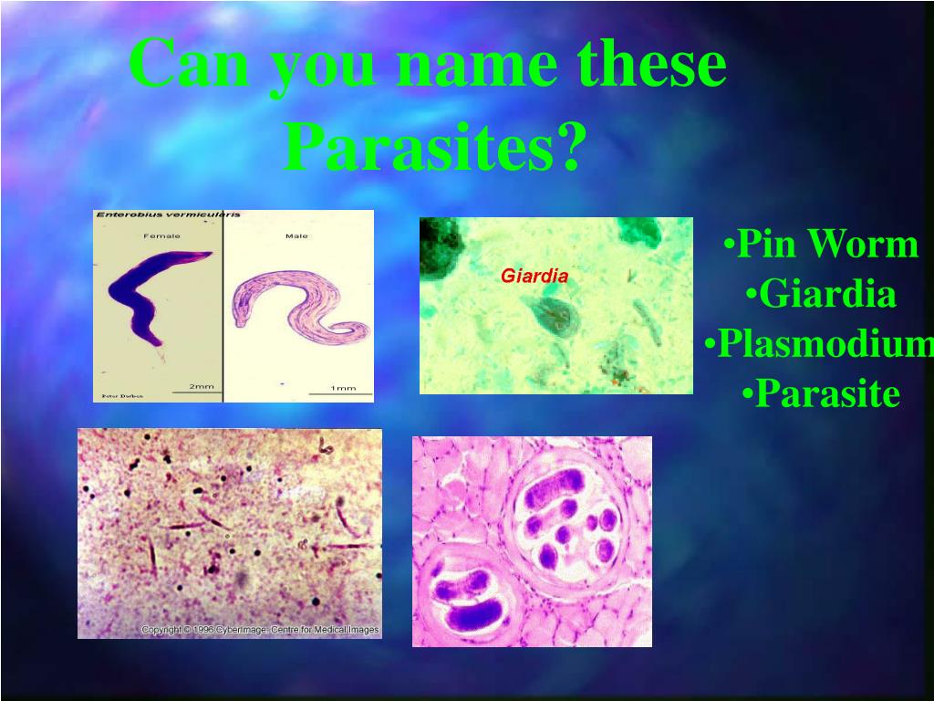 Can you name these Parasites? • Pin Worm • Giardia • Plasmodium • Parasite