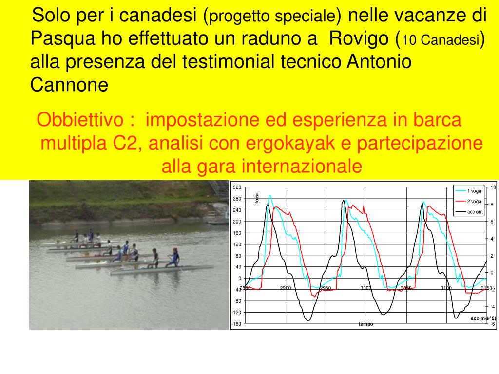 Solo per i canadesi (progetto speciale) nelle vacanze di Pasqua ho effettuato un raduno a Rovigo (10 Canadesi) alla presenza del testimonial tecnico Antonio Cannone Obbiettivo : impostazione ed esperienza in barca multipla C2, analisi con ergokayak e partecipazione alla gara internazionale
