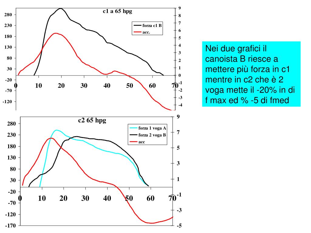 Nei due grafici il canoista B riesce a mettere più forza in c1 mentre in c2 che è 2 voga mette il -20% in di f max ed % -5 di fmed
