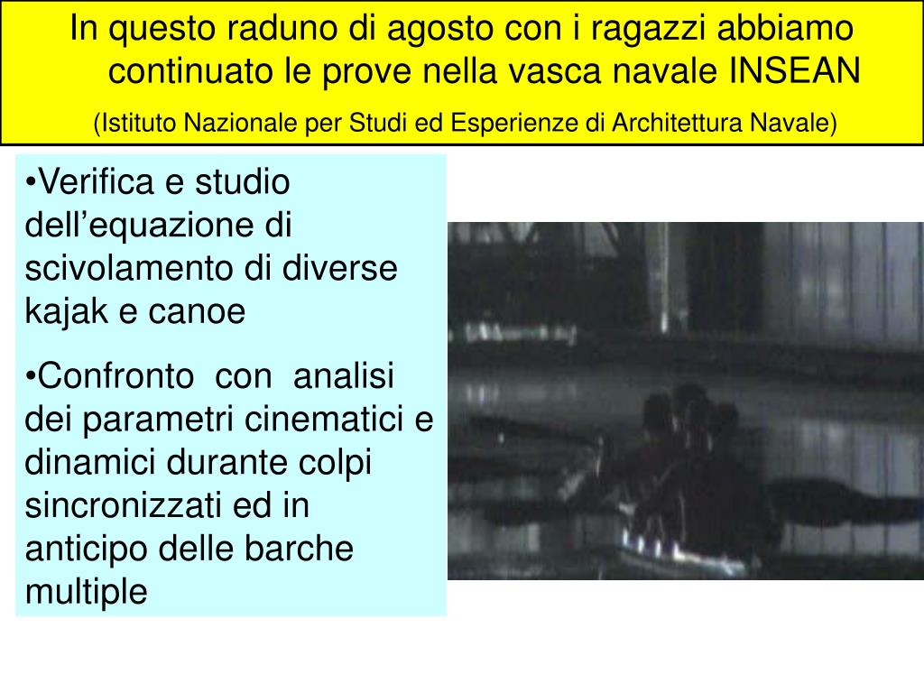 In questo raduno di agosto con i ragazzi abbiamo continuato le prove nella vasca navale INSEAN (Istituto Nazionale per Studi ed Esperienze di Architettura Navale) • Verifica e studio dell’equazione di scivolamento di diverse kajak e canoe • Confronto con analisi dei parametri cinematici e dinamici durante colpi sincronizzati ed in anticipo delle barche multiple