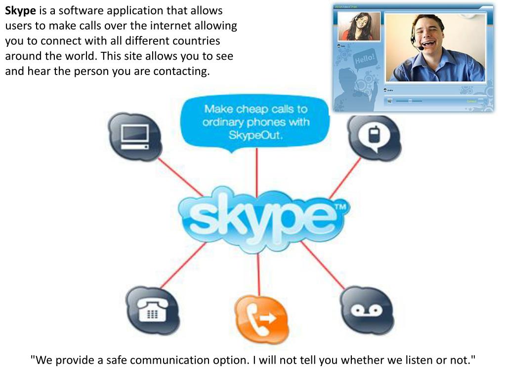 Skype is a software application that allows users to make calls over the internet allowing you to connect with all different countries around the world. This site allows you to see and hear the person you are contacting. "We provide a safe communication option. I will not tell you whether we listen or not."
