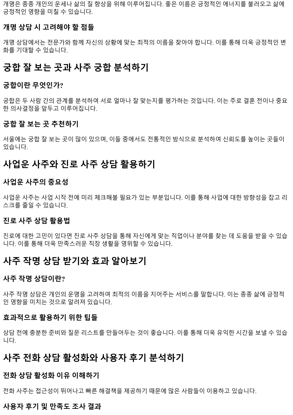 2. 개명은종종개인의운세나삶의질향상을위해이루어집니다. 좋은이름은긍정적인에너지를불러오고삶에 긍정적인영향을미칠수있습니다. 개명상담시고려해야할점들 개명상담에서는전문가와함께자신의상황에맞는최적의이름을찾아야합니다. 이를통해더욱긍정적인변 화를기대할수있습니다. 궁합잘보는곳과사주궁합분석하기 궁합이란무엇인가? 궁합은두사람간의관계를분석하여서로얼마나잘맞는지를평가하는것입니다. 이는주로결혼전이나중요 한의사결정을앞두고이루어집니다. 궁합잘보는곳추천하기 서울에는궁합잘보는곳이많이있으며, 이들중에서도전통적인방식으로분석하여신뢰도를높이는곳들이 있습니다. 사업운사주와진로사주상담활용하기 사업운사주의중요성 사업운사주는사업시작전에미리체크해볼필요가있는부분입니다. 이를통해사업에대한방향성을잡고리 스크를줄일수있습니다. 진로사주상담활용법 진로에대한고민이있다면진로사주상담을통해자신에게맞는직업이나분야를찾는데도움을받을수있습 니다. 이를통해더욱만족스러운직장생활을영위할수있습니다. 사주작명상담받기와효과알아보기 사주작명상담이란? 사주작명상담은개인의운명을고려하여최적의이름을지어주는서비스를말합니다. 이는종종삶에긍정적 인영향을미치는것으로알려져있습니다. 효과적으로활용하기위한팁들 상담전에충분한준비와질문리스트를만들어두는것이좋습니다. 이를통해더욱유익한시간을보낼수있습 니다. 사주전화상담활성화와사용자후기분석하기 전화상담활성화이유이해하기 전화사주는접근성이뛰어나고빠른해결책을제공하기때문에많은사람들이이용하고있습니다. 사용자후기및만족도조사결과
