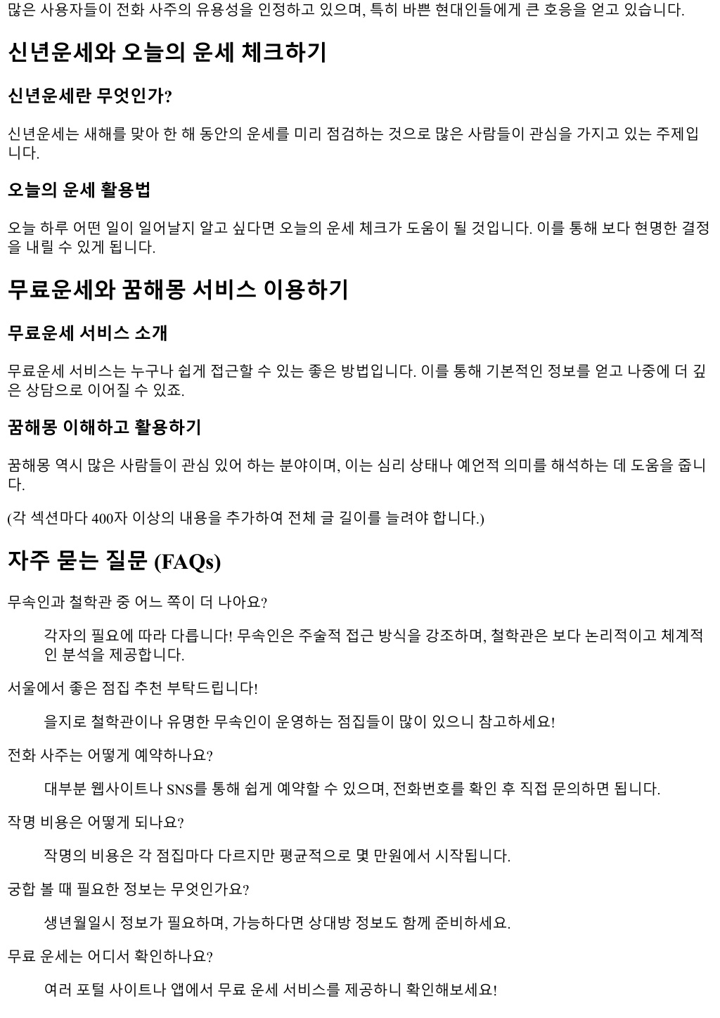 3. 많은사용자들이전화사주의유용성을인정하고있으며, 특히바쁜현대인들에게큰호응을얻고있습니다. 신년운세와오늘의운세체크하기 신년운세란무엇인가? 신년운세는새해를맞아한해동안의운세를미리점검하는것으로많은사람들이관심을가지고있는주제입 니다. 오늘의운세활용법 오늘하루어떤일이일어날지알고싶다면오늘의운세체크가도움이될것입니다. 이를통해보다현명한결정 을내릴수있게됩니다. 무료운세와꿈해몽서비스이용하기 무료운세서비스소개 무료운세서비스는누구나쉽게접근할수있는좋은방법입니다. 이를통해기본적인정보를얻고나중에더깊 은상담으로이어질수있죠. 꿈해몽이해하고활용하기 꿈해몽역시많은사람들이관심있어하는분야이며, 이는심리상태나예언적의미를해석하는데도움을줍니 다. (각섹션마다 400자이상의내용을추가하여전체글길이를늘려야합니다.) 자주묻는질문 (FAQs) 무속인과철학관중어느쪽이더나아요? 각자의필요에따라다릅니다! 무속인은주술적접근방식을강조하며, 철학관은보다논리적이고체계적 인분석을제공합니다. 서울에서좋은점집추천부탁드립니다! 을지로철학관이나유명한무속인이운영하는점집들이많이있으니참고하세요! 전화사주는어떻게예약하나요? 대부분웹사이트나 SNS를통해쉽게예약할수있으며, 전화번호를확인후직접문의하면됩니다. 작명비용은어떻게되나요? 작명의비용은각점집마다다르지만평균적으로몇만원에서시작됩니다. 궁합볼때필요한정보는무엇인가요? 생년월일시정보가필요하며, 가능하다면상대방정보도함께준비하세요. 무료운세는어디서확인하나요? 여러포털사이트나앱에서무료운세서비스를제공하니확인해보세요!