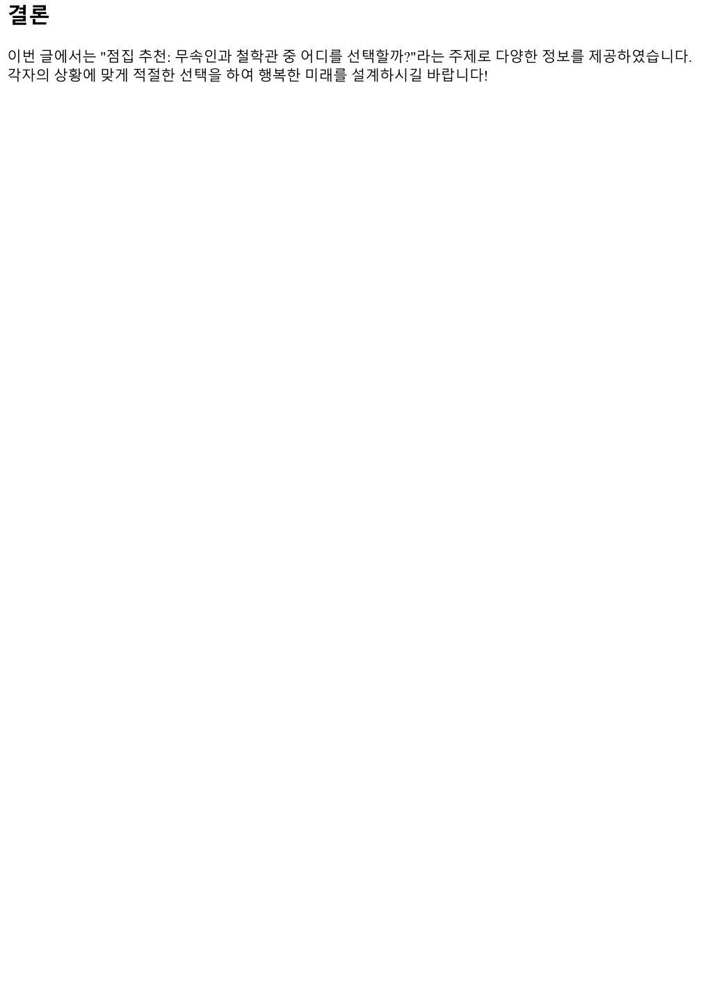 4. 결론 이번글에서는 "점집추천: 무속인과철학관중어디를선택할까?"라는주제로다양한정보를제공하였습니다. 각자의상황에맞게적절한선택을하여행복한미래를설계하시길바랍니다!