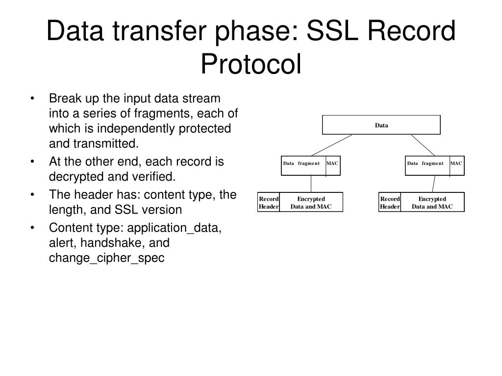 Data transfer phase: SSL Record Protocol • Break up the input data stream into a series of fragments, each of which is independently protected and transmitted. • At the other end, each record is decrypted and verified. • The header has: content type, the length, and SSL version • Content type: application_data, alert, handshake, and change_cipher_spec