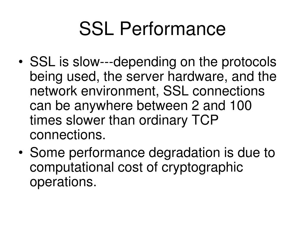 SSL Performance • SSL is slow---depending on the protocols being used, the server hardware, and the network environment, SSL connections can be anywhere between 2 and 100 times slower than ordinary TCP connections. • Some performance degradation is due to computational cost of cryptographic operations.