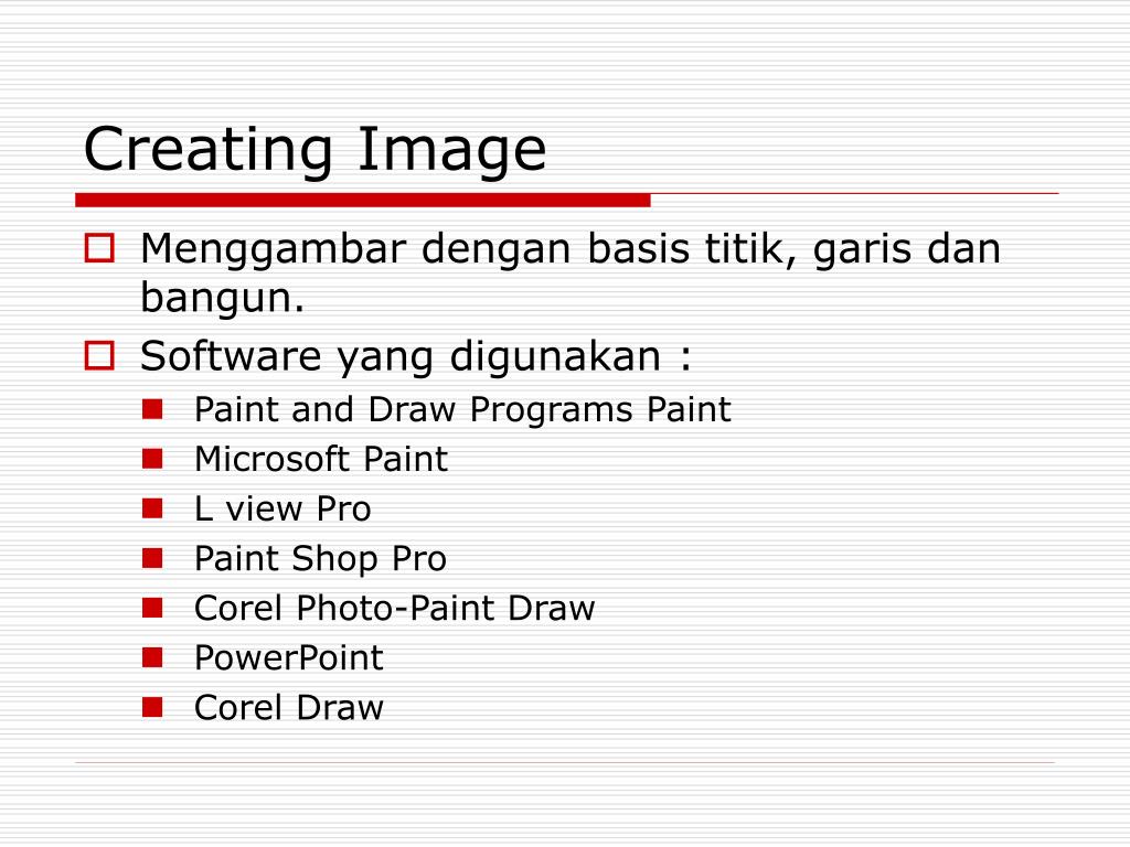 Creating Image • Menggambar dengan basis titik, garis dan bangun. • Software yang digunakan : • Paint and Draw Programs Paint • Microsoft Paint • L view Pro • Paint Shop Pro • Corel Photo‑Paint Draw • PowerPoint • Corel Draw