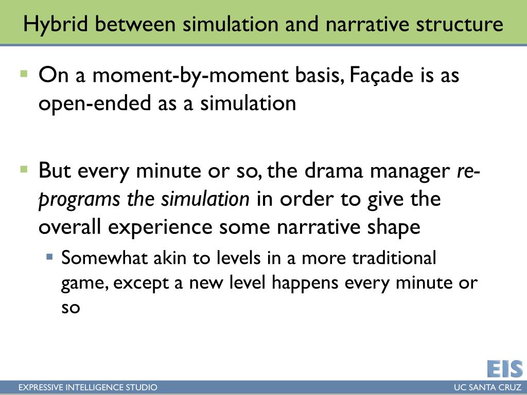 Hybrid between simulation and narrative structure • On a moment-by-moment basis, Façade is as open-ended as a simulation • But every minute or so, the drama manager re-programs the simulation in order to give the overall experience some narrative shape • Somewhat akin to levels in a more traditional game, except a new level happens every minute or so
