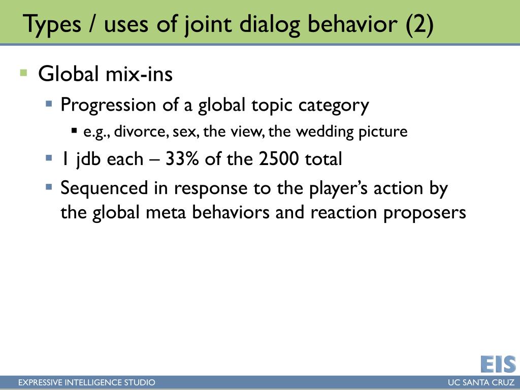 Types / uses of joint dialog behavior (2) • Global mix-ins • Progression of a global topic category • e.g., divorce, sex, the view, the wedding picture • 1 jdb each – 33% of the 2500 total • Sequenced in response to the player’s action by the global meta behaviors and reaction proposers