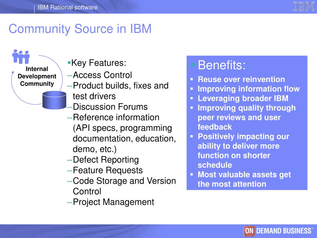 Community Source in IBM • Key Features: • Access Control • Product builds, fixes and test drivers • Discussion Forums • Reference information(API specs, programming documentation, education, demo, etc.) • Defect Reporting • Feature Requests • Code Storage and Version Control • Project Management • Benefits: • Reuse over reinvention • Improving information flow • Leveraging broader IBM • Improving quality through peer reviews and user feedback • Positively impacting our ability to deliver more function on shorter schedule • Most valuable assets get the most attention • Facilitate development Internal Development Community