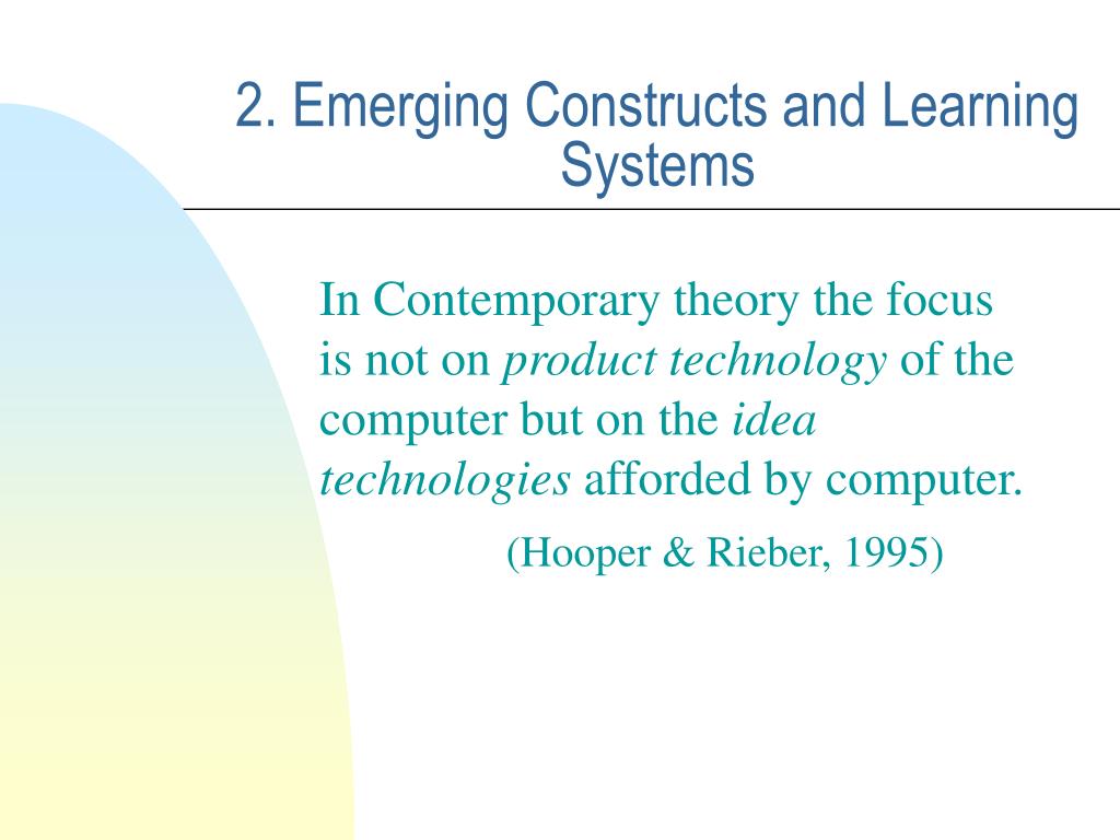 2. Emerging Constructs and Learning Systems In Contemporary theory the focus is not on product technology of the computer but on the idea technologies afforded by computer. (Hooper & Rieber, 1995)