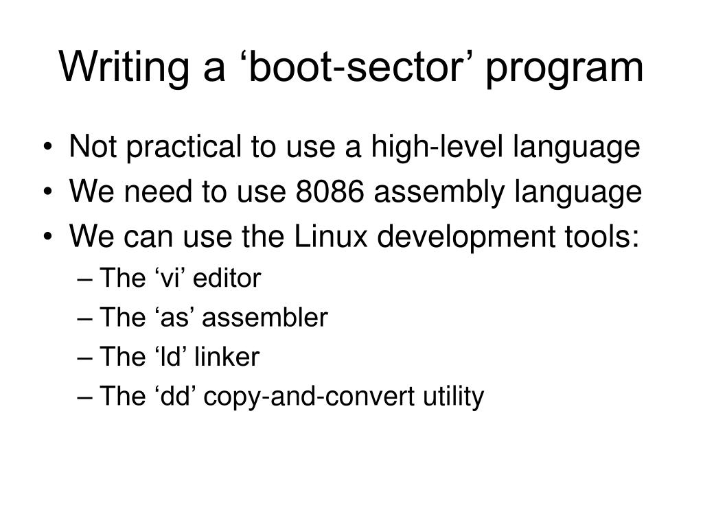 Writing a ‘boot-sector’ program • Not practical to use a high-level language • We need to use 8086 assembly language • We can use the Linux development tools: • The ‘vi’ editor • The ‘as’ assembler • The ‘ld’ linker • The ‘dd’ copy-and-convert utility