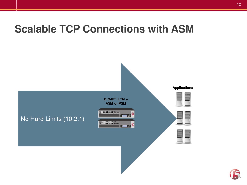 Scalable TCP Connections with ASM No Hard Limits (10.2.1) Applications 60K Connections (10.x) BIG-IP® LTM + ASM or PSM 15K Connections (9.x)