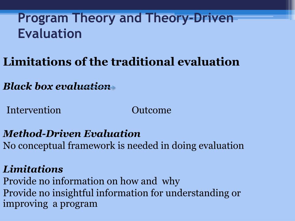 Program Theory and Theory-Driven Evaluation Limitations of the traditional evaluation Black box evaluation Intervention Outcome Method-Driven Evaluation No conceptual framework is needed in doing evaluation Limitations Provide no information on how and why Provide no insightful information for understanding or improving a program