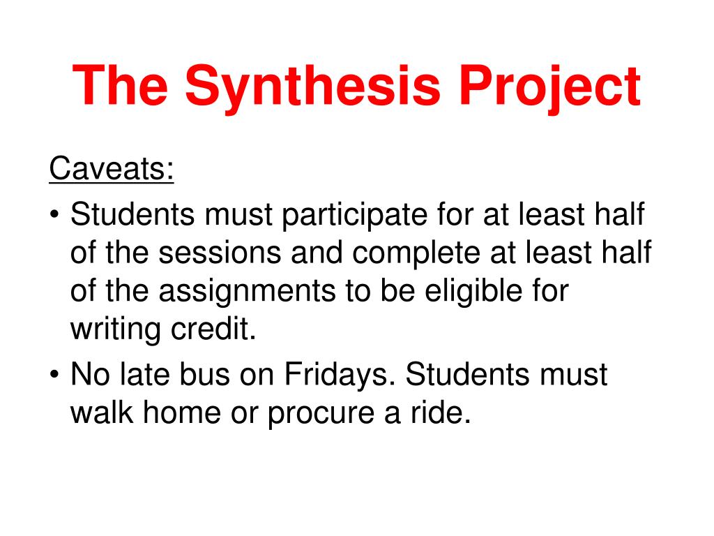 The Synthesis Project • Caveats: • Students must participate for at least half of the sessions and complete at least half of the assignments to be eligible for writing credit. • No late bus on Fridays. Students must walk home or procure a ride.