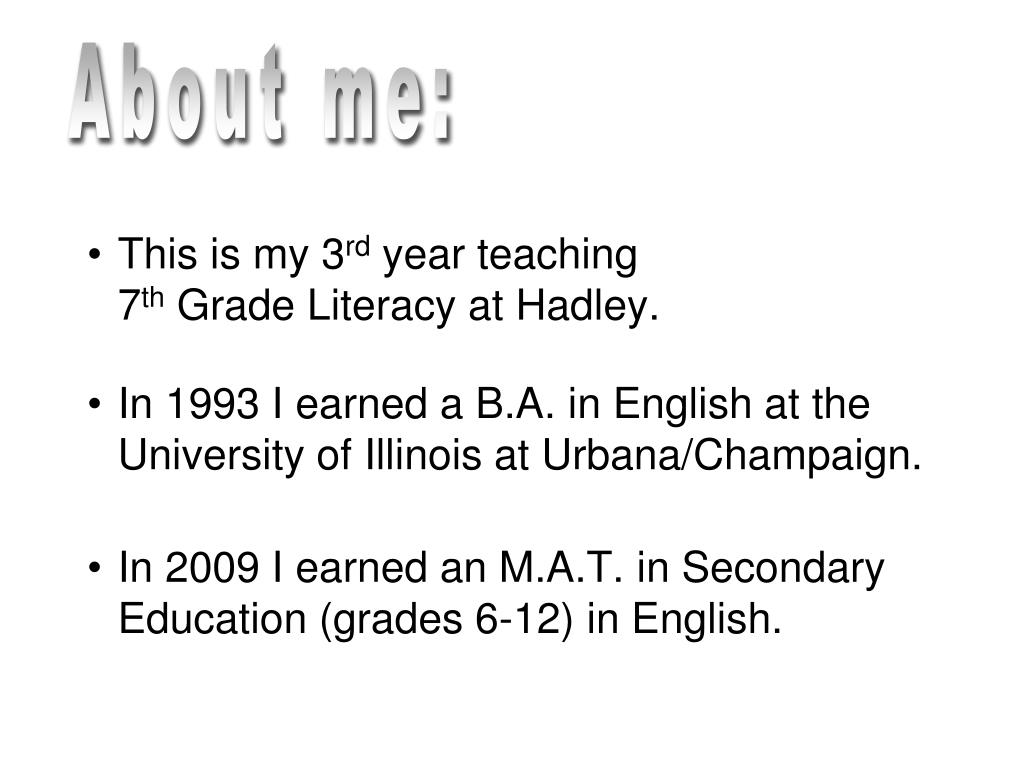 About me: • This is my 3rd year teaching 7th Grade Literacy at Hadley. • In 1993 I earned a B.A. in English at the University of Illinois at Urbana/Champaign. • In 2009 I earned an M.A.T. in Secondary Education (grades 6-12) in English.