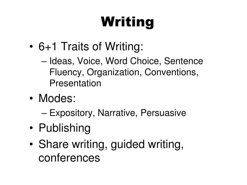Writing • 6+1 Traits of Writing: • Ideas, Voice, Word Choice, Sentence Fluency, Organization, Conventions, Presentation • Modes: • Expository, Narrative, Persuasive • Publishing • Share writing, guided writing, conferences