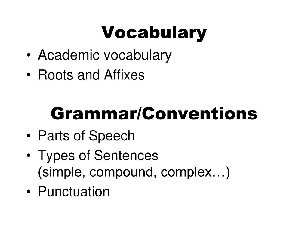 Vocabulary • Academic vocabulary • Roots and Affixes Grammar/Conventions • Parts of Speech • Types of Sentences (simple, compound, complex…) • Punctuation