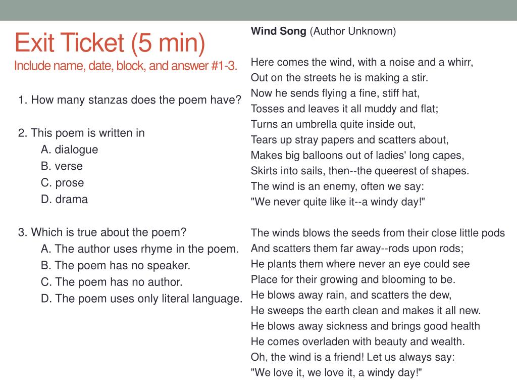 Exit Ticket (5 min)Include name, date, block, and answer #1-3. 1. How many stanzas does the poem have? 2. This poem is written in A. dialogue B. verse C. prose D. drama 3. Which is true about the poem? A. The author uses rhyme in the poem. B. The poem has no speaker. C. The poem has no author. D. The poem uses only literal language. Wind Song (Author Unknown) Here comes the wind, with a noise and a whirr, Out on the streets he is making a stir. Now he sends flying a fine, stiff hat, Tosses and leaves it all muddy and flat; Turns an umbrella quite inside out, Tears up stray papers and scatters about, Makes big balloons out of ladies' long capes, Skirts into sails, then--the queerest of shapes. The wind is an enemy, often we say: "We never quite like it--a windy day!" The winds blows the seeds from their close little pods And scatters them far away--rods upon rods; He plants them where never an eye could see Place for their growing and blooming to be. He blows away rain, and scatters the dew, He sweeps the earth clean and makes it all new. He blows away sickness and brings good health He comes overladen with beauty and wealth. Oh, the wind is a friend! Let us always say: "We love it, we love it, a windy day!"