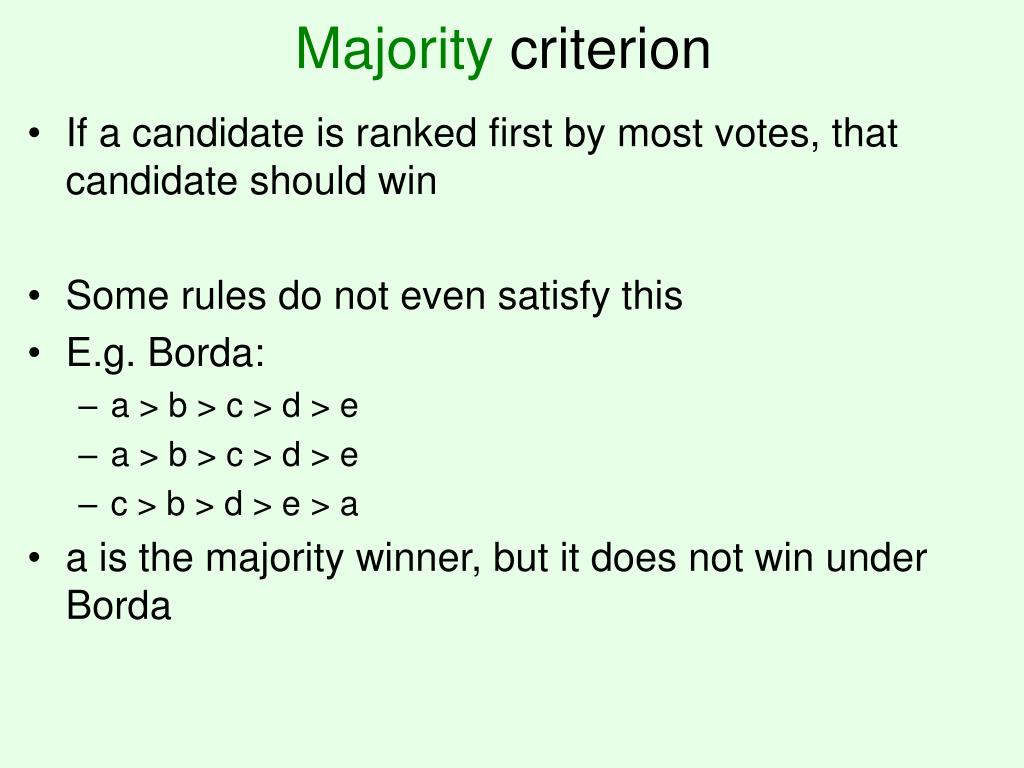 Majority criterion • If a candidate is ranked first by most votes, that candidate should win • Some rules do not even satisfy this • E.g. Borda: • a > b > c > d > e • a > b > c > d > e • c > b > d > e > a • a is the majority winner, but it does not win under Borda
