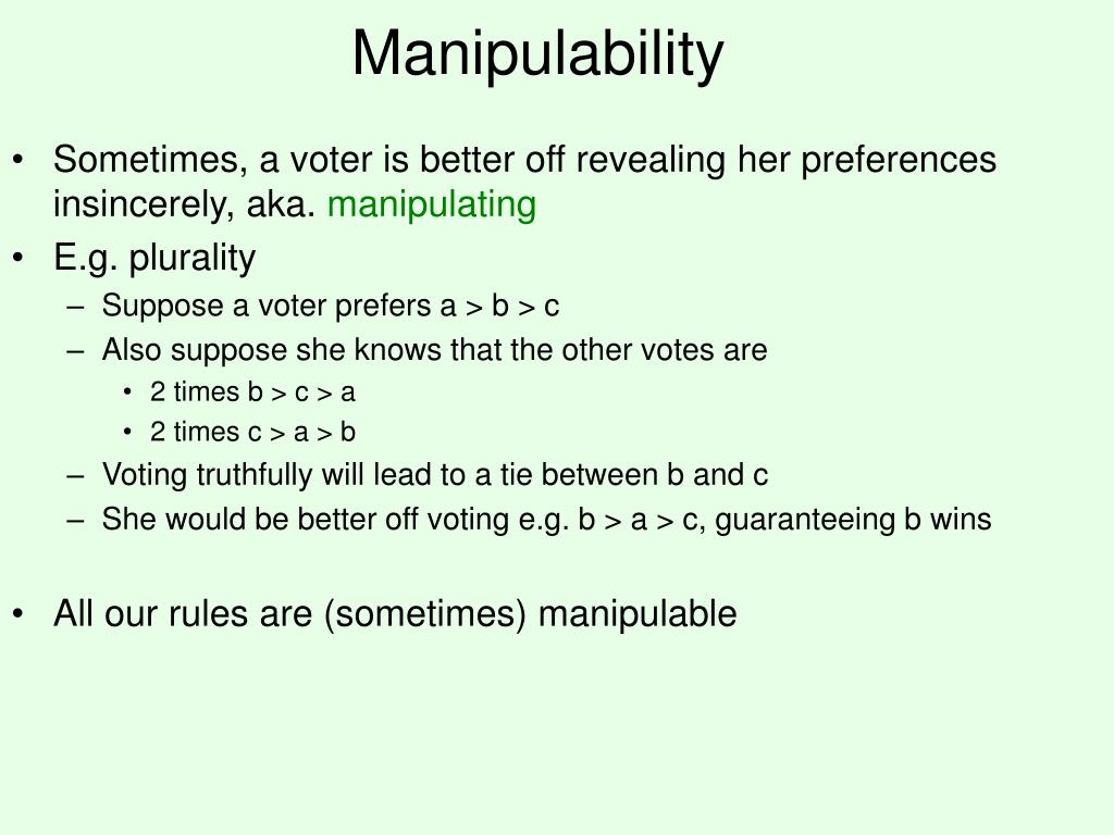 Manipulability • Sometimes, a voter is better off revealing her preferences insincerely, aka. manipulating • E.g. plurality • Suppose a voter prefers a > b > c • Also suppose she knows that the other votes are • 2 times b > c > a • 2 times c > a > b • Voting truthfully will lead to a tie between b and c • She would be better off voting e.g. b > a > c, guaranteeing b wins • All our rules are (sometimes) manipulable