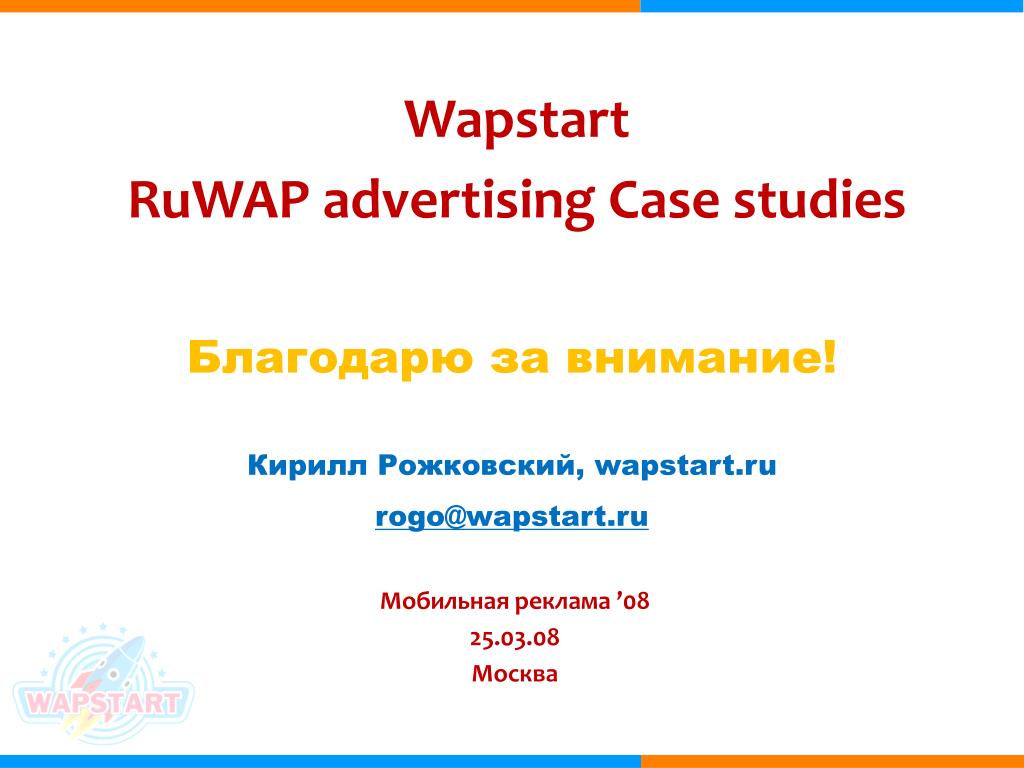 Wapstart RuWAP advertising Case studies Благодарю за внимание! Кирилл Рожковский, wapstart.ru rogo@wapstart.ru Мобильная реклама ’08 25.03.08 Москва