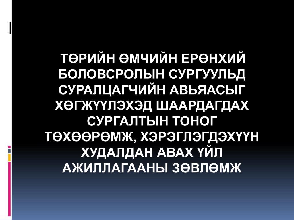ТӨРИЙН ӨМЧИЙН ЕРӨНХИЙ БОЛОВСРОЛЫН СУРГУУЛЬД СУРАЛЦАГЧИЙН АВЬЯАСЫГ ХӨГЖҮҮЛЭХЭД ШААРДАГДАХ СУРГАЛТЫН ТОНОГ ТӨХӨӨРӨМЖ, ХЭРЭГЛЭГДЭХҮҮН ХУДАЛДАН АВАХ ҮЙЛ АЖИЛЛАГААНЫ ЗӨВЛӨМЖ