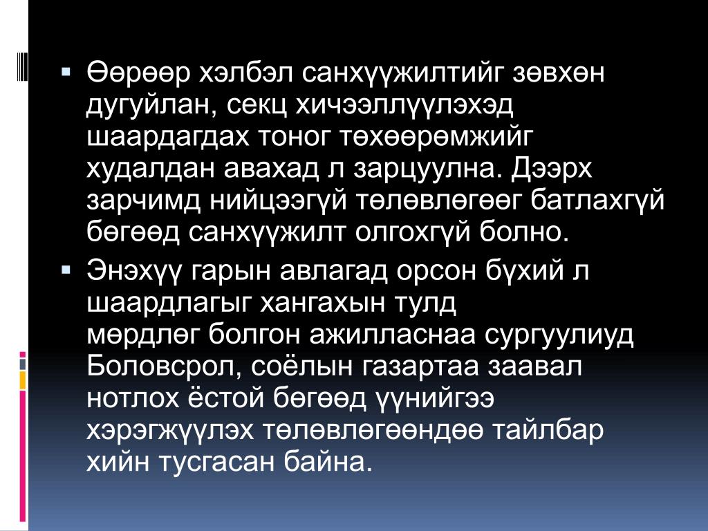 3.Тайлагнах • Аймаг, нийслэлийн Боловсролын газар сургуулиудын тайланг нэгтгэж, Боловсрол, шинжлэх ухааны яаманд 2014 оны 5 дугаар сарын 15-ны дотор багтаан хүргүүлнэ. • Худалдан авах үйл ажиллагааны мэдээллийг сургуулийн мэдээллийн самбарт байршуулж, олон нийтэд өргөнөөр сурталчилна. • Сургалтын тоног төхөөрөмжийг үндсэн хөрөнгө, бараа материалын дансанд тус тус бүртгэж, санхүүгийн тайланд тусгана.