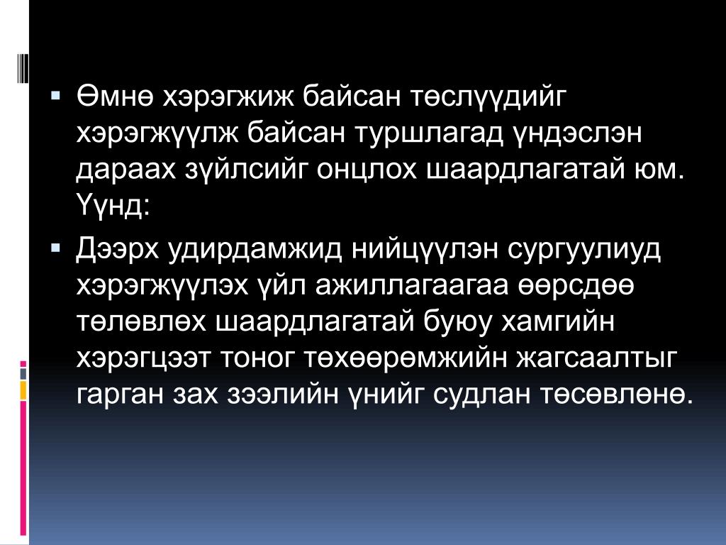 2. Хэрэгжүүлэх • Бараа ажил, үйлчилгээ худалдан авах үйл ажиллагааг “Төрийн болон орон нутгийн өмчийн хөрөнгөөр бараа, ажил, үйлчилгээ худалдан авах тухай” Монгол Улсын хуульд нийцүүлнэ.
