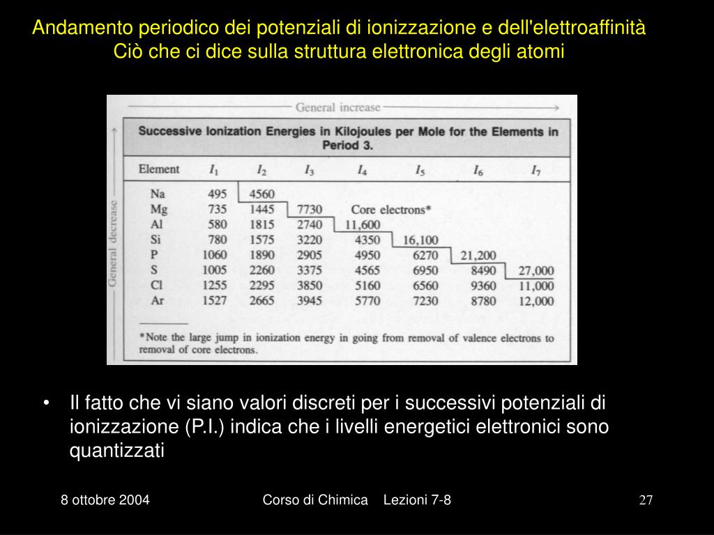 Andamento periodico dei potenziali di ionizzazione e dell'elettroaffinitàCiò che ci dice sulla struttura elettronica degli atomi • Il fatto che vi siano valori discreti per i successivi potenziali di ionizzazione (P.I.) indica che i livelli energetici elettronici sono quantizzati Corso di Chimica Lezioni 7-8