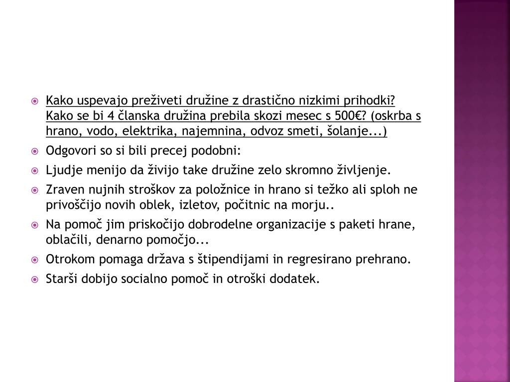 Kako uspevajo preživeti družine z drastično nizkimi prihodki? Kako se bi 4 članska družina prebila skozi mesec s 500€? (oskrba s hrano, vodo, elektrika, najemnina, odvoz smeti, šolanje...) • Odgovori so si bili precej podobni: • Ljudje menijo da živijo take družine zelo skromno življenje. • Zraven nujnih stroškov za položnice in hrano si težko ali sploh ne privoščijo novih oblek, izletov, počitnic na morju.. • Na pomoč jim priskočijo dobrodelne organizacije s paketi hrane, oblačili, denarno pomočjo... • Otrokom pomaga država s štipendijami in regresirano prehrano. • Starši dobijo socialno pomoč in otroški dodatek.
