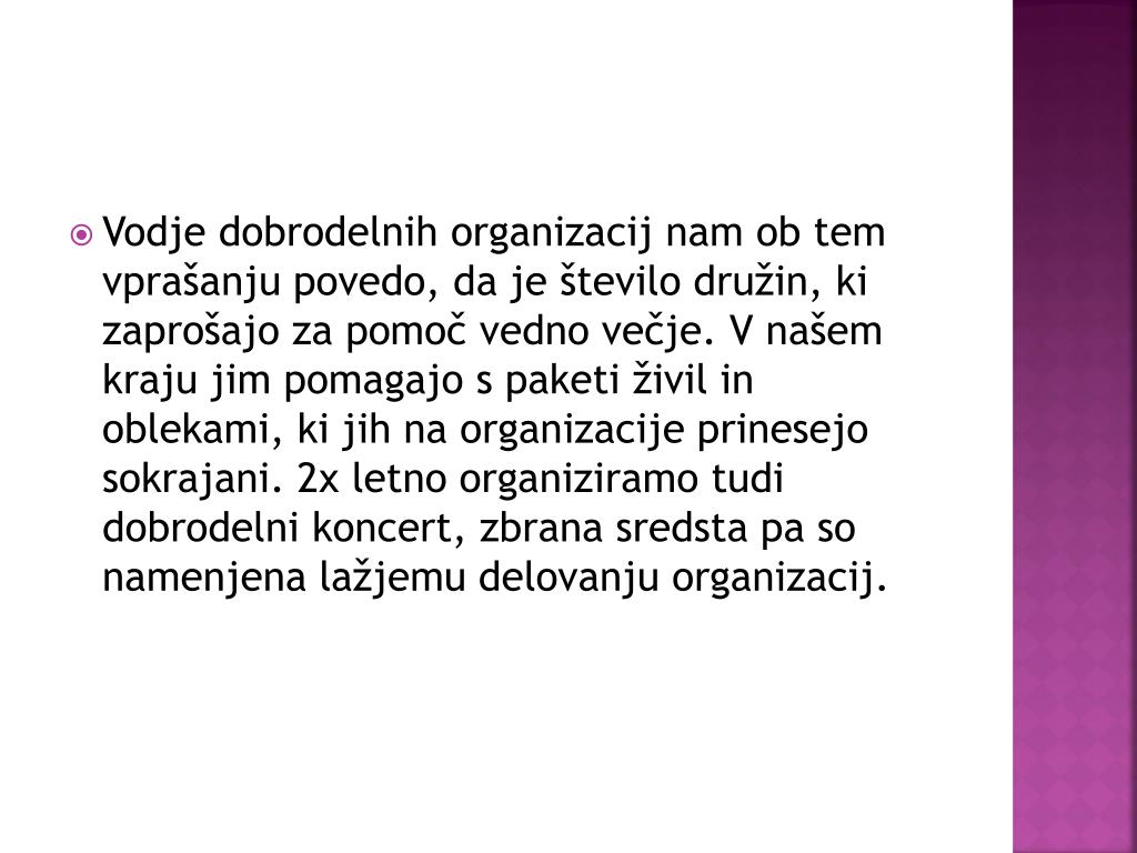 Vodje dobrodelnih organizacij nam ob tem vprašanju povedo, da je število družin, ki zaprošajo za pomoč vedno večje. V našem kraju jim pomagajo s paketi živil in oblekami, ki jih na organizacije prinesejo sokrajani. 2x letno organiziramo tudi dobrodelni koncert, zbrana sredsta pa so namenjena lažjemu delovanju organizacij.