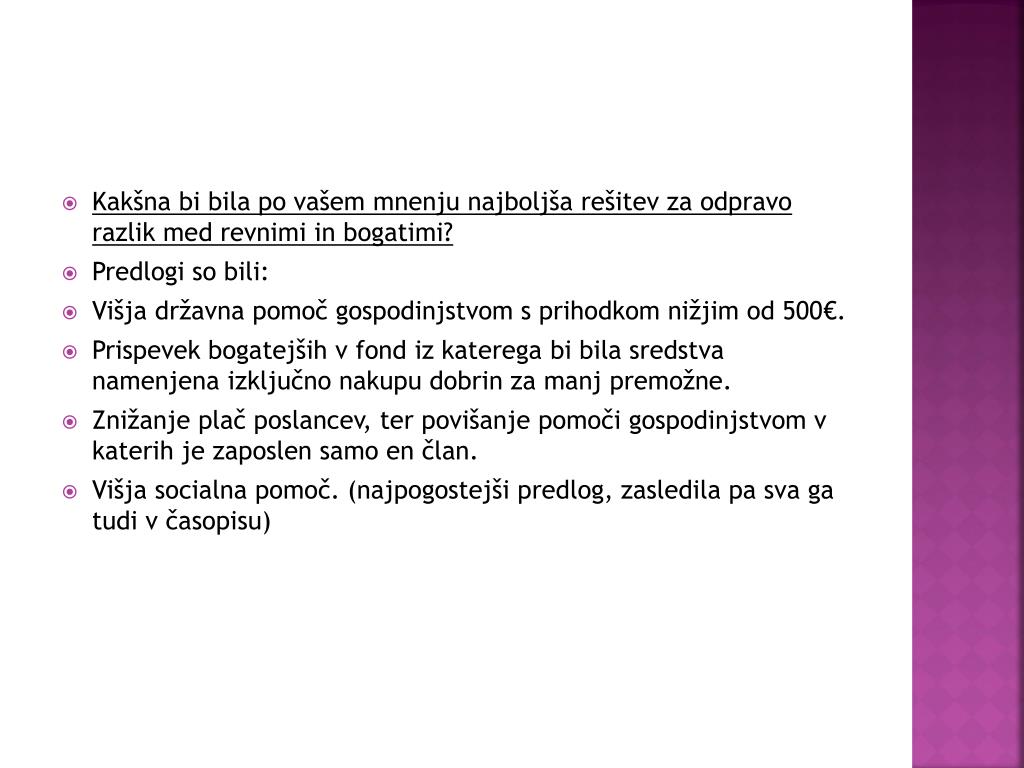 Kakšna bi bila po vašem mnenju najboljša rešitev za odpravo razlik med revnimi in bogatimi? • Predlogi so bili: • Višja državna pomoč gospodinjstvom s prihodkom nižjim od 500€. • Prispevek bogatejših v fond iz katerega bi bila sredstva namenjena izključno nakupu dobrin za manj premožne. • Znižanje plač poslancev, ter povišanje pomoči gospodinjstvom v katerih je zaposlen samo en član. • Višja socialna pomoč. (najpogostejši predlog, zasledila pa sva ga tudi v časopisu)