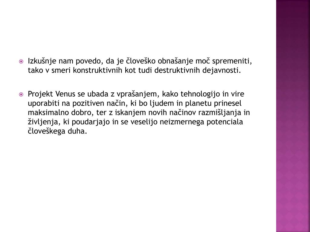 Izkušnjenampovedo, da je človeškoobnašanjemočspremeniti, tako v smerikonstruktivnihkottudidestruktivnihdejavnosti. • Projekt Venus se ubada z vprašanjem, kakotehnologijo in vireuporabitinapozitivennačin, kiboljudem in planetuprineselmaksimalnodobro, ter z iskanjemnovihnačinovrazmišljanja in življenja, kipoudarjajo in se veselijoneizmernegapotencialačloveškegaduha.
