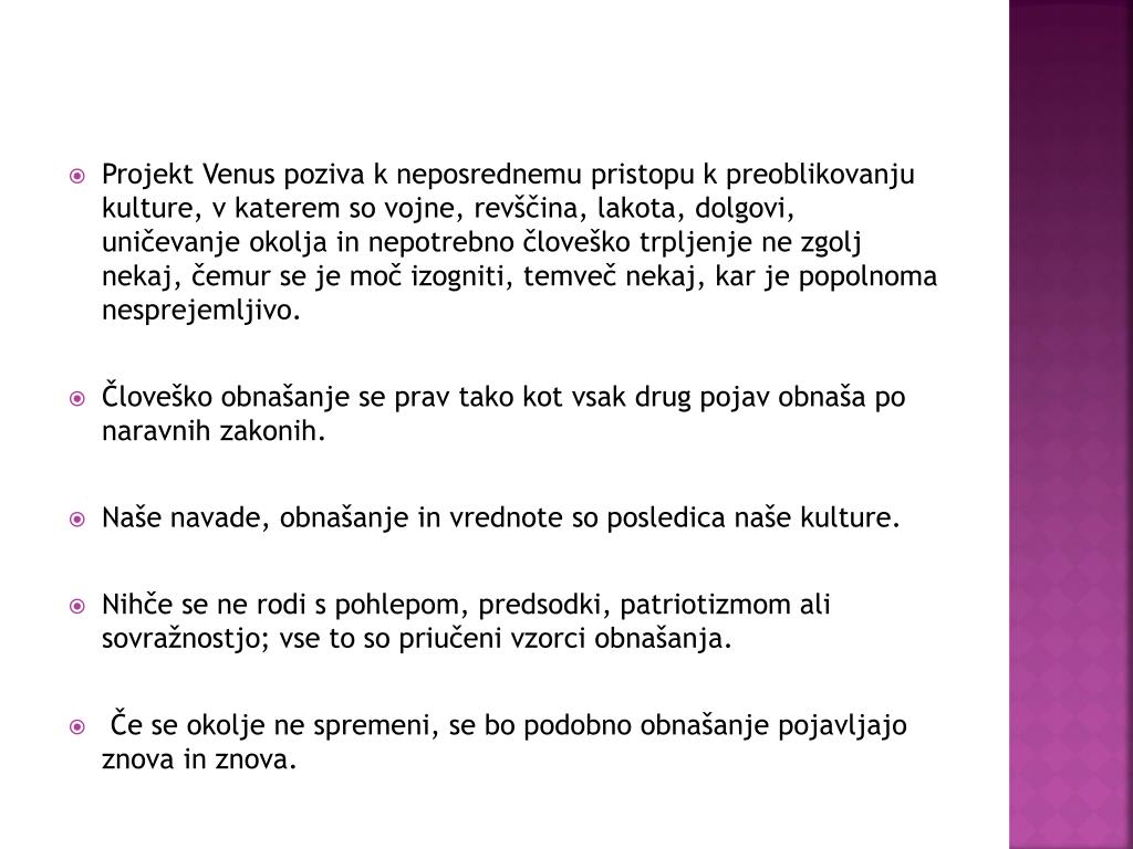 Projekt Venus poziva k neposrednemupristopu k preoblikovanjukulture, v katerem sovojne, revščina, lakota, dolgovi, uničevanjeokolja in nepotrebnočloveškotrpljenje ne zgoljnekaj, čemur se je močizogniti, temvečnekaj, kar je popolnomanesprejemljivo. • Človeškoobnašanje se pravtakokotvsak drug pojavobnašaponaravnihzakonih. • Našenavade, obnašanje in vrednote so posledicanašekulture. • Nihče se ne rodi s pohlepom, predsodki, patriotizmomalisovražnostjo; vse to so priučenivzorciobnašanja. • Če se okolje ne spremeni, se bopodobnoobnašanjepojavljajoznova in znova.