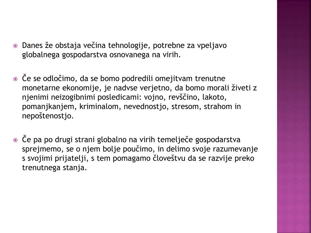 Danes žeobstajavečinatehnologije, potrebnezavpeljavoglobalnegagospodarstvaosnovaneganavirih. • Če se odločimo, da se bomopodrediliomejitvamtrenutnemonetarneekonomije, je nadvseverjetno, dabomomoraliživeti z njenimineizogibnimiposledicami: vojno, revščino, lakoto, pomanjkanjem, kriminalom, nevednostjo, stresom, strahom in nepoštenostjo. • Če pa podrugistraniglobalnonavirihtemelječegospodarstvasprejmemo, se o njemboljepoučimo, in delimosvojerazumevanje s svojimiprijatelji, s tem pomagamočloveštvuda se razvijeprekotrenutnegastanja.