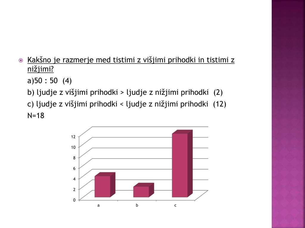 Kakšno je razmerje med tistimi z višjimi prihodki in tistimi z nižjimi? a)50 : 50 (4) b) ljudje z višjimi prihodki > ljudje z nižjimi prihodki (2) c) ljudje z višjimi prihodki < ljudje z nižjimi prihodki (12) N=18
