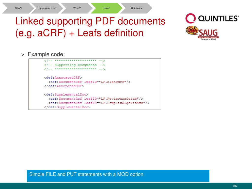 Requirements? • What? • How? • Summary • Why? Linked supporting PDF documents (e.g. aCRF) + Leafs definition • Example code: Simple FILE and PUT statements with a MOD option