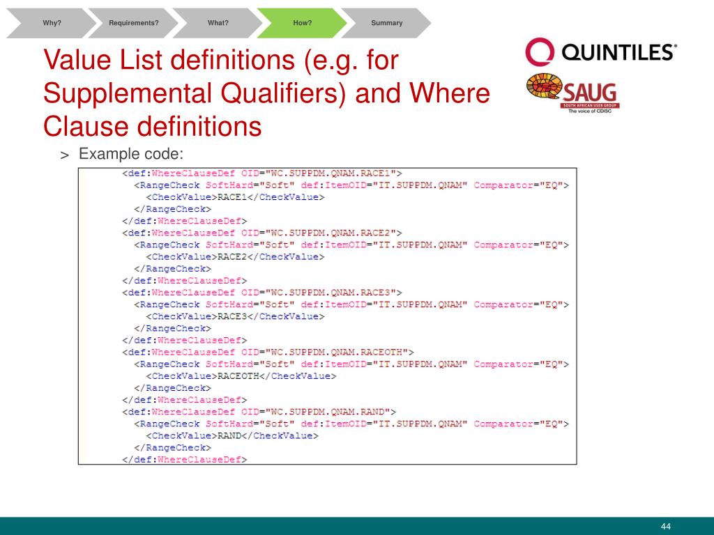 Requirements? • What? • How? • Summary • Why? Value List definitions (e.g. for Supplemental Qualifiers) and Where Clause definitions • Example code: Example: SUPPDM.QVAL Output a WHERECLAUSEDEF statement for each value of SUPPDM.QVAL (e.g. RACE1) and use the same WHERECLAUSE name referenced in the ITEMREF.