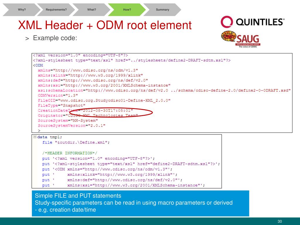 Requirements? • What? • How? • Summary • Why? XML Header + ODM root element • Example code: Simple FILE and PUT statements Study-specific parameters can be read in using macro parameters or derived - e.g. creation date/time