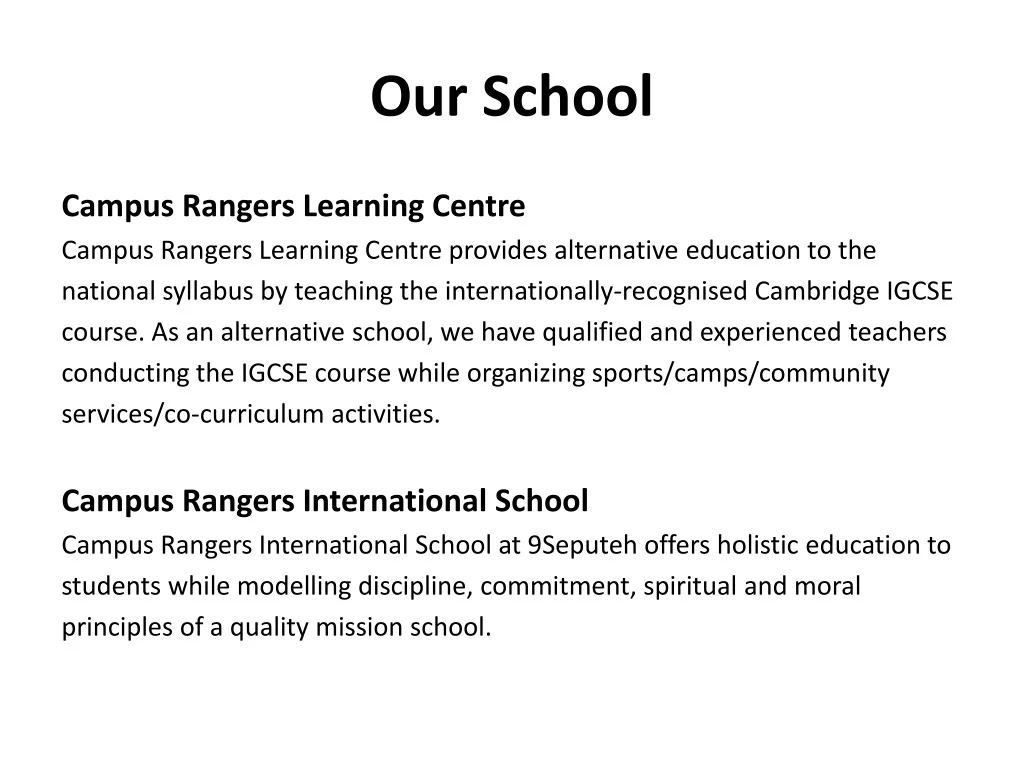 Our School Campus Rangers Learning Centre Campus Rangers Learning Centre provides alternative education to the national syllabus by teaching the internationally-recognised Cambridge IGCSE course. As an alternative school, we have qualified and experienced teachers conducting the IGCSE course while organizing sports/camps/community services/co-curriculum activities. Campus Rangers International School Campus Rangers International School at 9Seputeh offers holistic education to students while modelling discipline, commitment, spiritual and moral principles of a quality mission school.