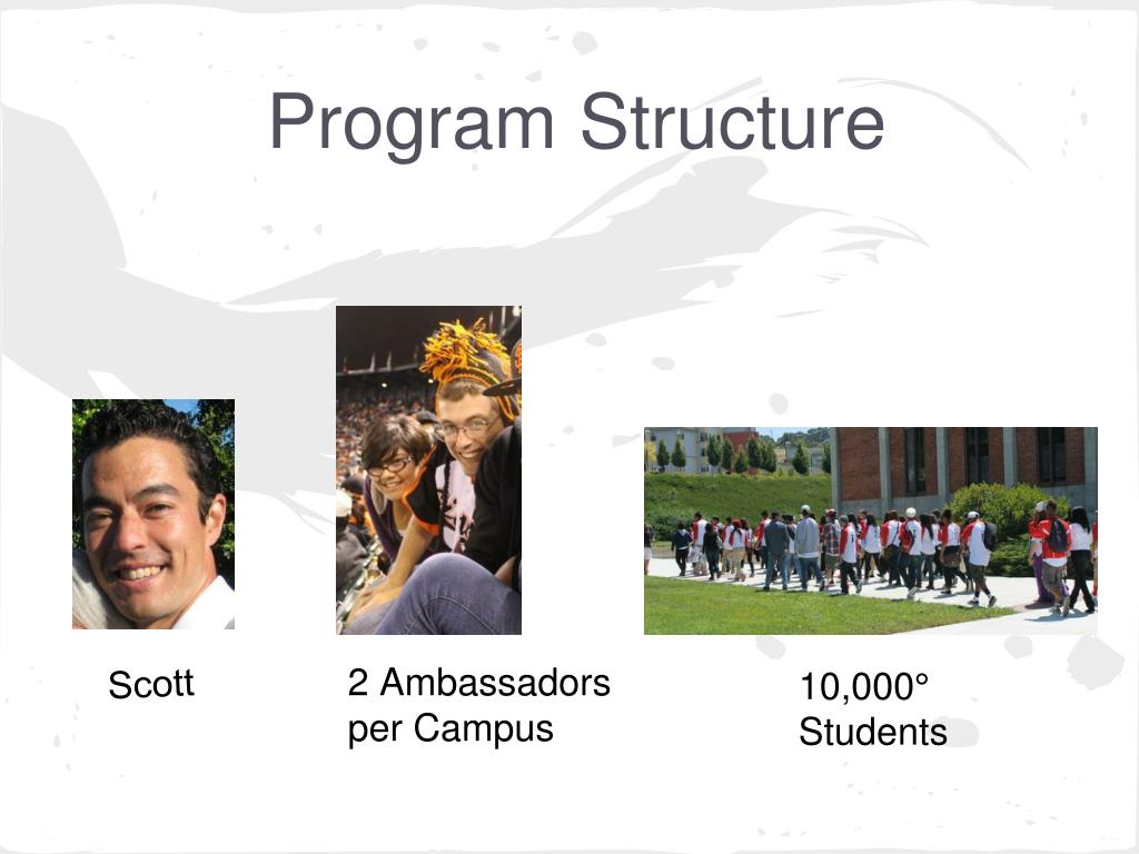 Program Structure 2 Ambassadors per Campus Scott 10,000° Students